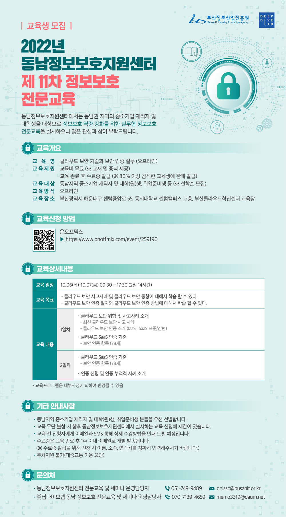동남정보보호지원센터에서는 동남권 지역의 중소기업 재직자 및 대학생을 대상으로 정보보호 역량 강화를 위한 실무형 정보보호 전문교육을 실시합니다.